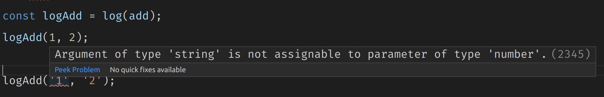 function log (fn) { const name = fn.name; return function (...args) { console.log(`entering ${name}`); const rtn = fn(...args); console.log(`leaving ${name}`); }; } function add(a:number, b: number) { return a + b; } add(1, 2); add('1', '2'); //warning // const logAdd = log(add); //type information is lost logAdd(1, 2); logAdd('1', '2'); //no warning